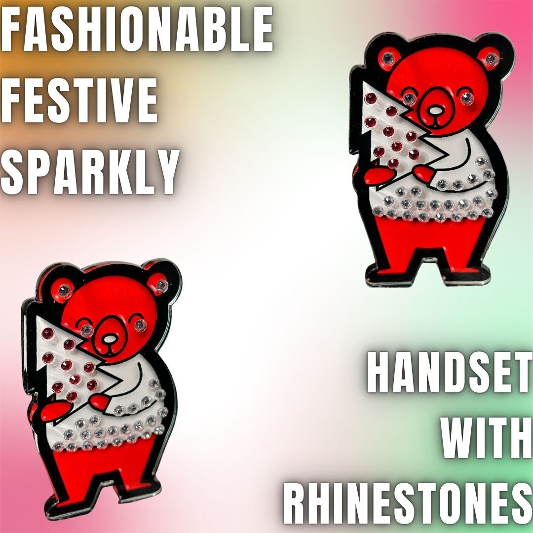 Spread festive cheer with our adorable Red Bear Pin! This delightful design showcases a vibrant red bear holding a sparkling holiday tree, adorned with stunning red and clear rhinestones for a bold and festive look. Perfect for holiday accessorizing or as a thoughtful gift for someone special.
