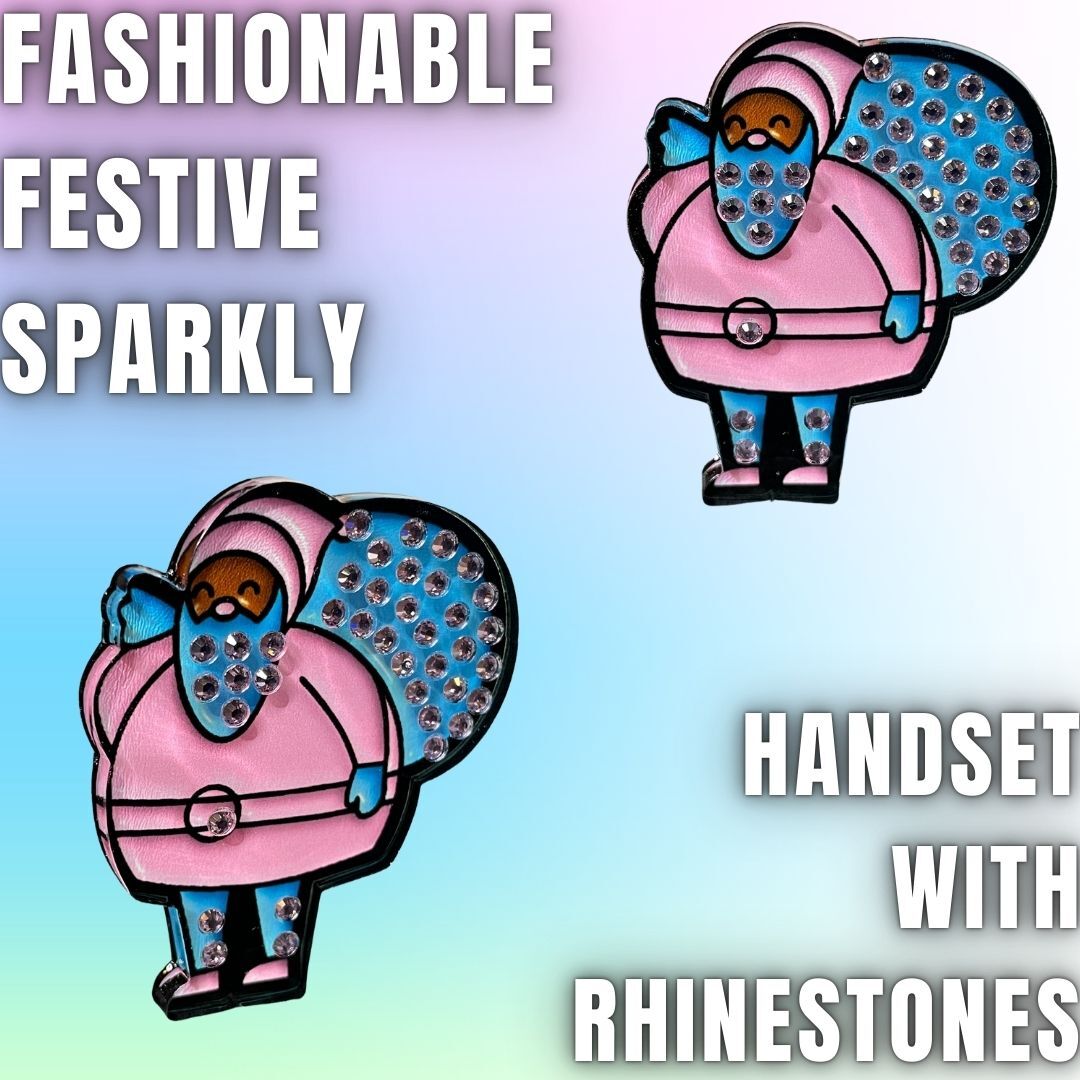 Make your holidays extra bright with our charming Pink Santa with Blue Bag Pin! Featuring a cheerful pink Santa carrying a sparkling blue gift bag, this unique design is handset with shimmering rhinestones for a festive and fun look. Perfect for accessorizing your holiday wardrobe or gifting to someone special.