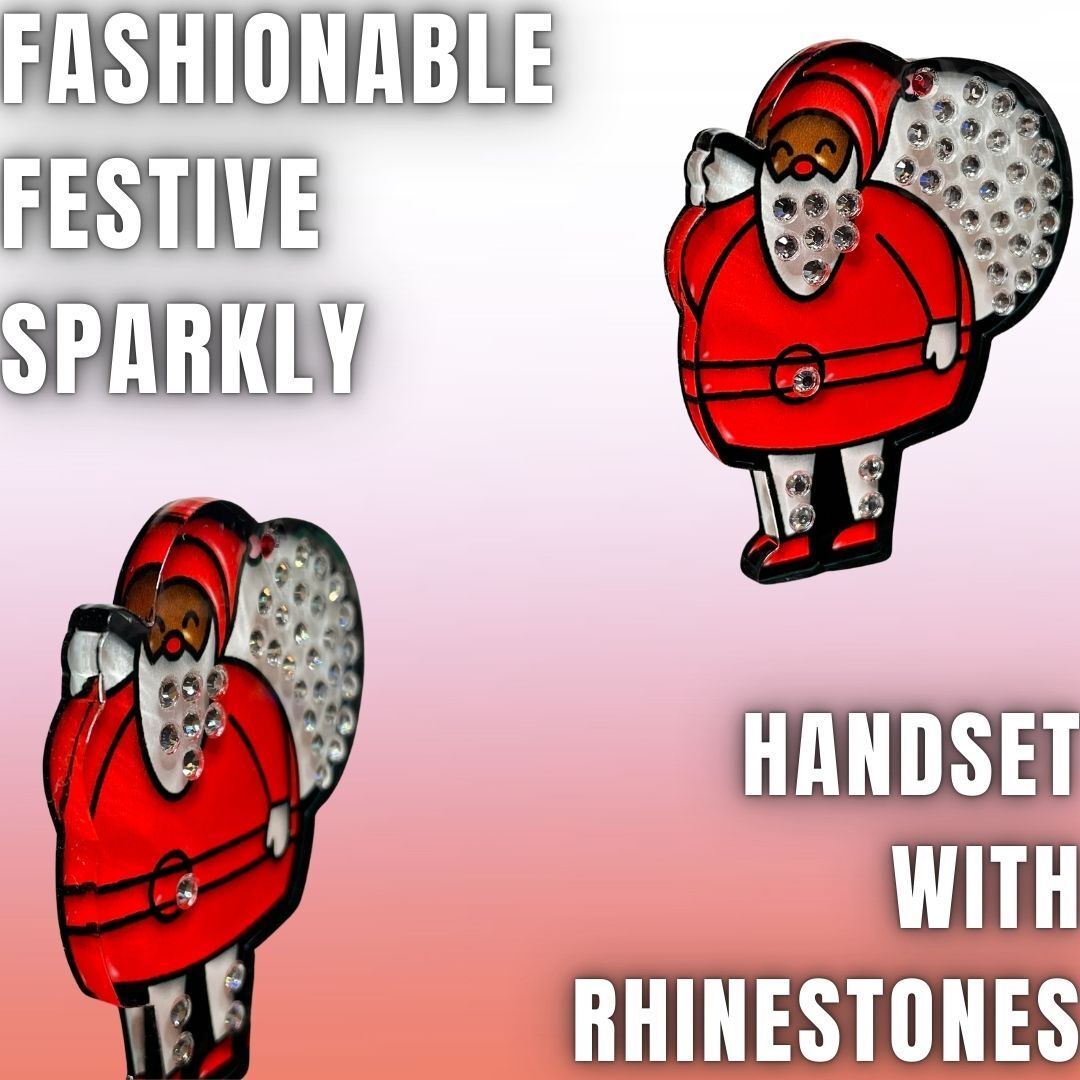 Celebrate the holiday season in style with the Classic Red Santa Pin! This timeless design features a jolly red Santa carrying a shimmering sack of gifts, adorned with dazzling clear rhinestones for a festive sparkle. Perfect for holiday outfits, gift-giving, or adding a cheerful touch to your accessories.