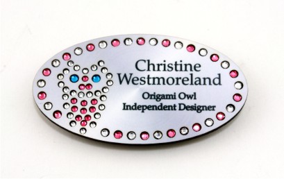 "1.5X3" Owl Oval Bling Name Badge with Mix Stones and Magnet backing