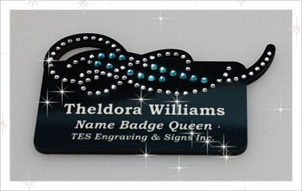 1.5"x3" SWIRLS OF BLING, BLING NAME BADGE WITH CLEAR AND AQUA STONES AND MAGNET BACKING.